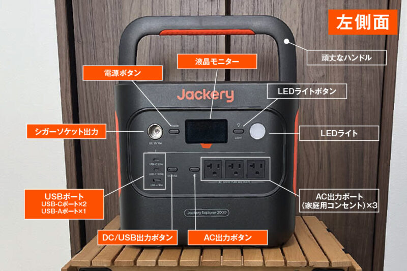残りのバッテリー残量(%)、入力・出力W数、充電中か放電中かなどがひと目でわかる。停電時やキャンプ中でも「あと何時間使えるか」がわかるのは安心ポイント。 - AC出力ポート(家庭用コンセント)×3