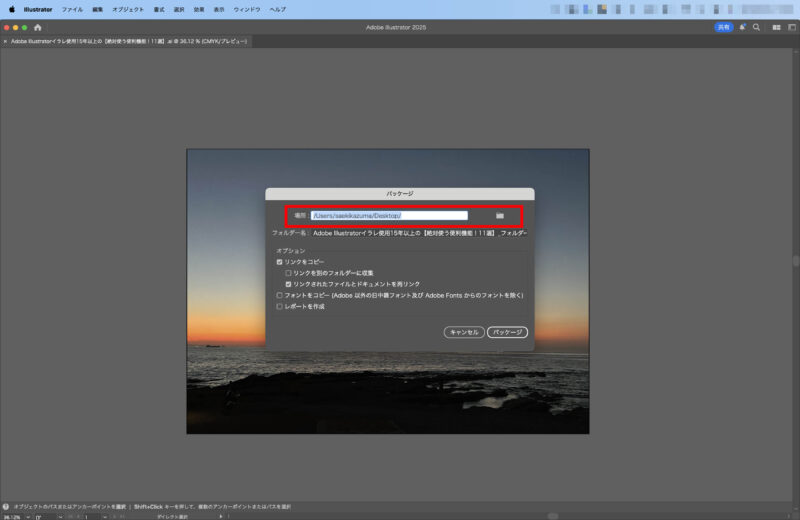 「パッケージ」をクリックして、保存先のフォルダをチェック!