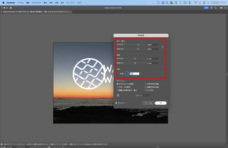 パスの変形 | 拡大・縮小・回転・移動を一括で適用 | [効果] → [パスの変形] → [変形] | 均等な変形が可能、調整がラク |