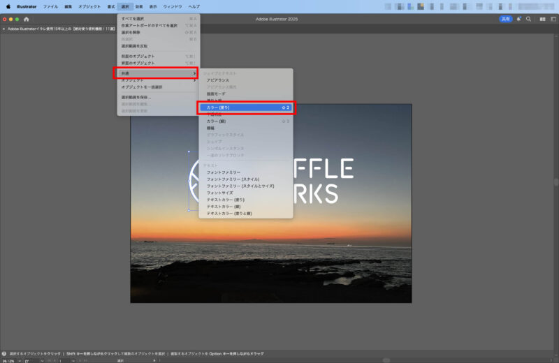共通 | 同じ属性を持つオブジェクトを一括選択 | [選択] → [共通] → 塗り/線幅/カラーなど | 修正が一瞬、デザインの統一感を保てる |