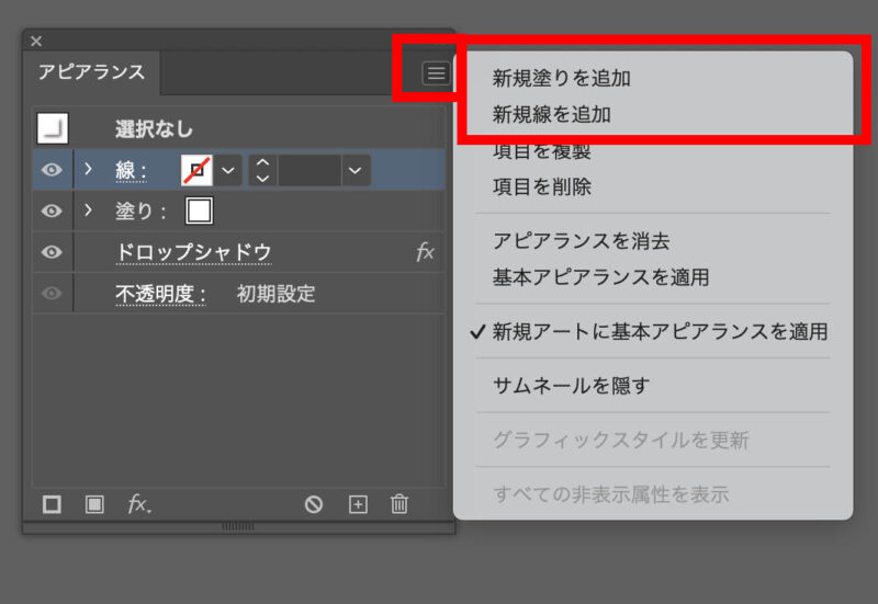 アピアランス | 線や塗り、効果を重ねて管理 | [ウィンドウ] → [アピアランス] → 追加/調整 | 複雑な見た目を1つのオブジェクトで作成可能 |
