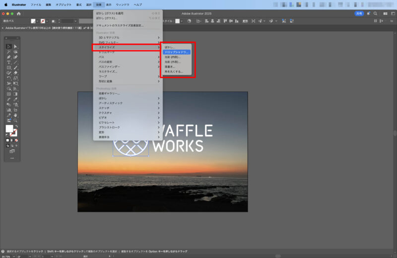 スタイライズ | ドロップシャドウや光彩などの効果 | [効果] → [スタイライズ] → 効果を選択 | デザインを立体的・印象的に |